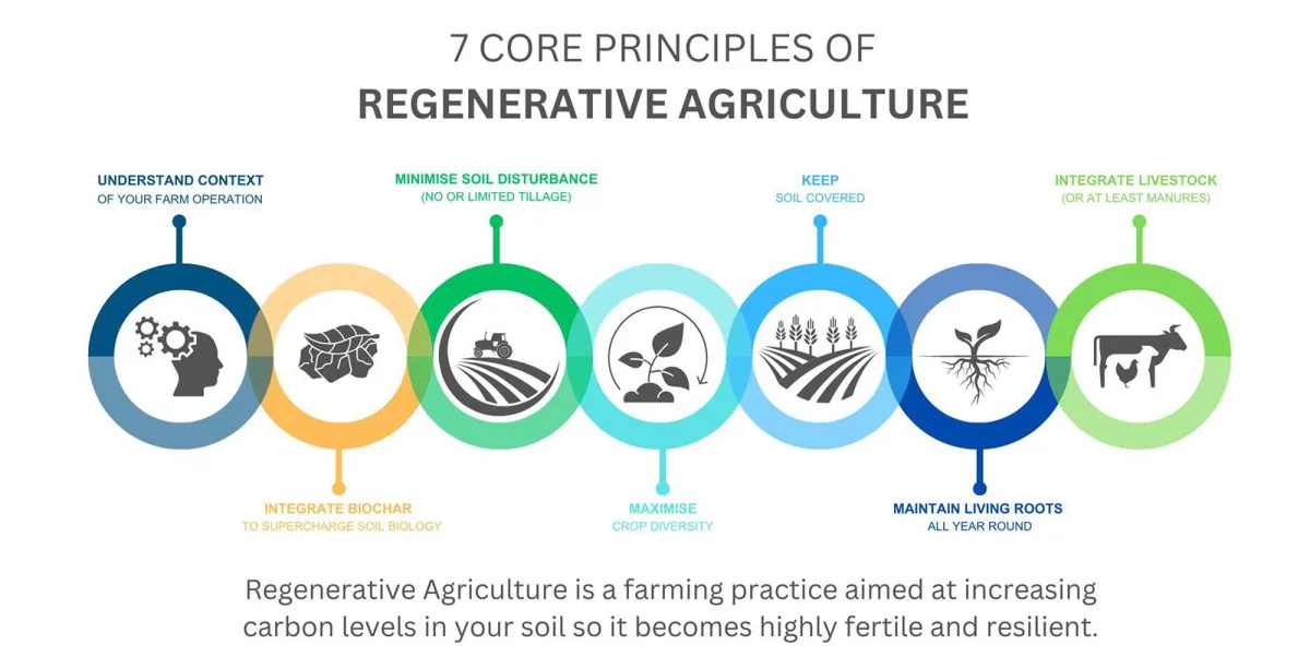 Regenerative Agriculture is a farming practice based around 7 core principles that increase carbon levels and microbes in your soil so it becomes highly fertile and resilient.